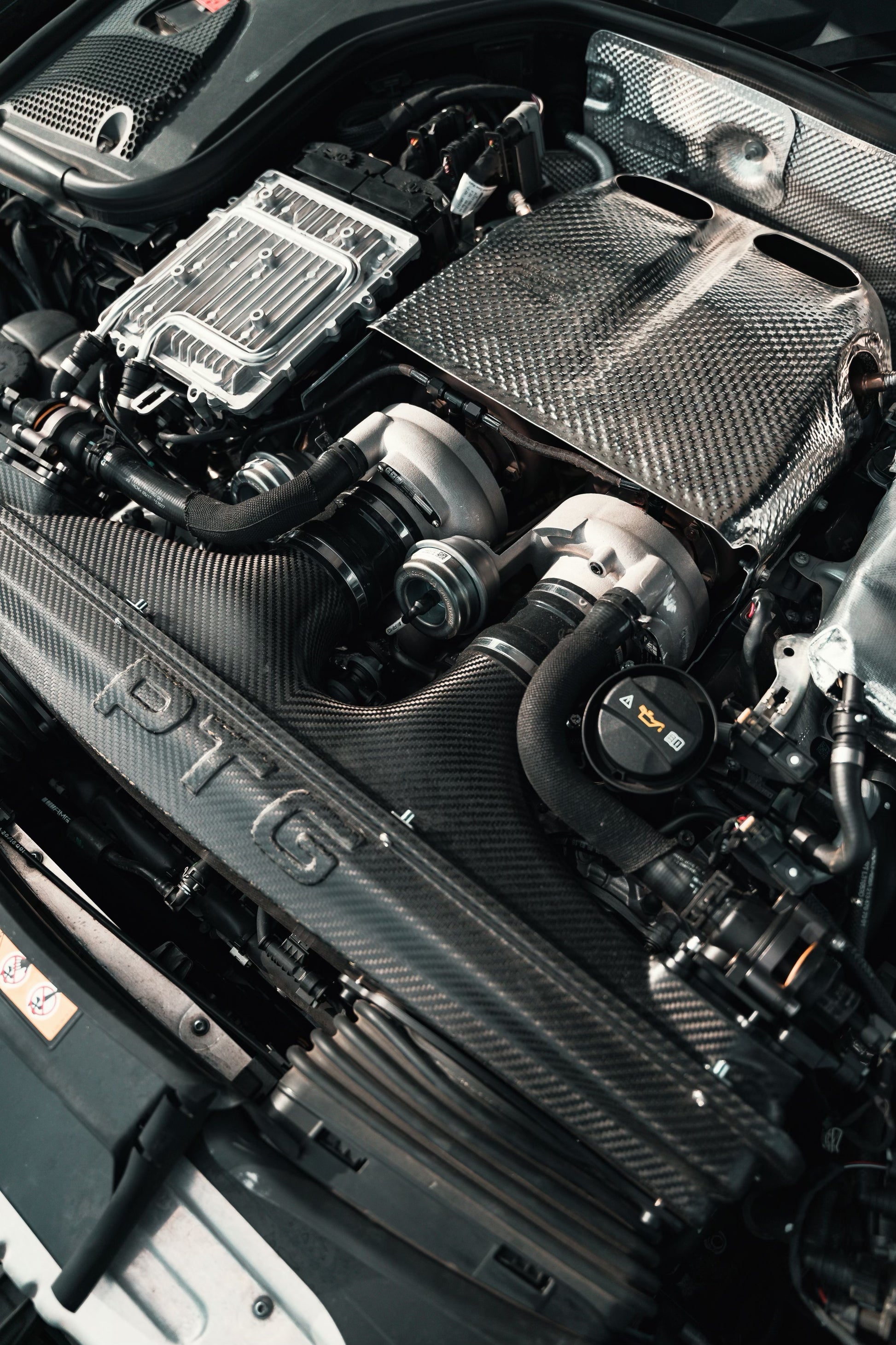 Designed utilizing 3D scan technology and produced completely in aerospace level "prepreg" carbon fiber and hard anodized billet aluminum, these satin finished carbon airboxes are a zero restriction intake system that have substantial gains on vehicles from stock to our PTG-X 1,300HP package.